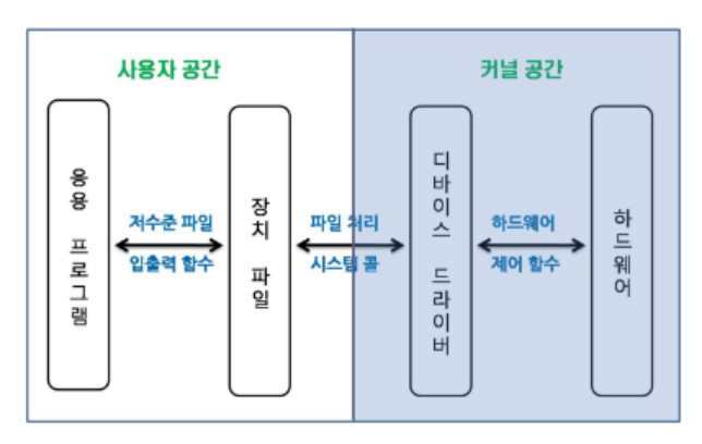 하드웨어를 사용하기 위한 디바이스 드라이버와 디바이스 드라이버와 연결하여, 장치를 제어할 장치파일이 존재한다.