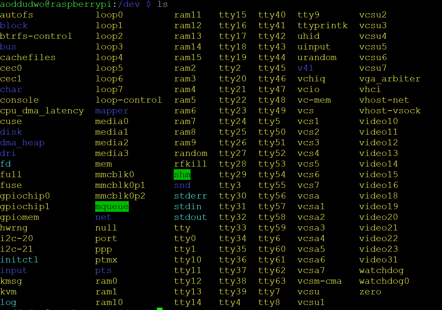 위는 라즈베리파이의 장치파일인데, 보이는 것처럼 /dev 내부에 여러가지 장치파일이 존재하며 몇가지를 설명하면