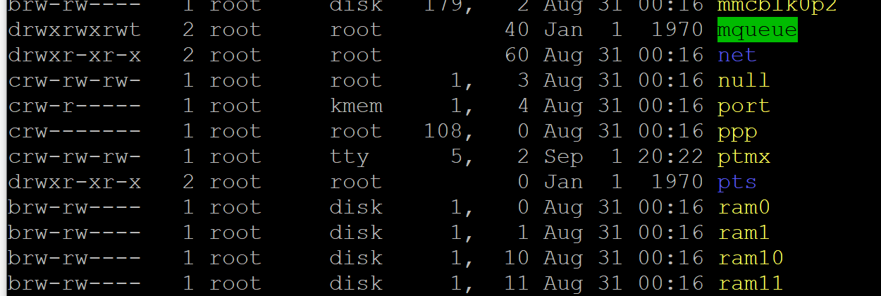 - tty, tty0, tty1, etc.: 이 파일들은 터미널 인터페이스를 나타낸다. 각각의 tty 장치는 터미널 또는 콘솔 인터페이스와 연결된다.