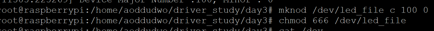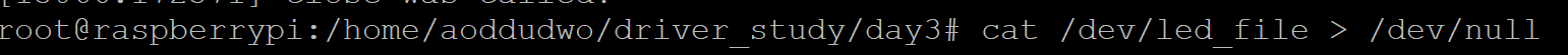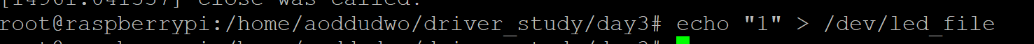 장치 파일에 쓰기작업으로 led on, 읽기작업으로 1이 출력된것을 볼 수 있음.